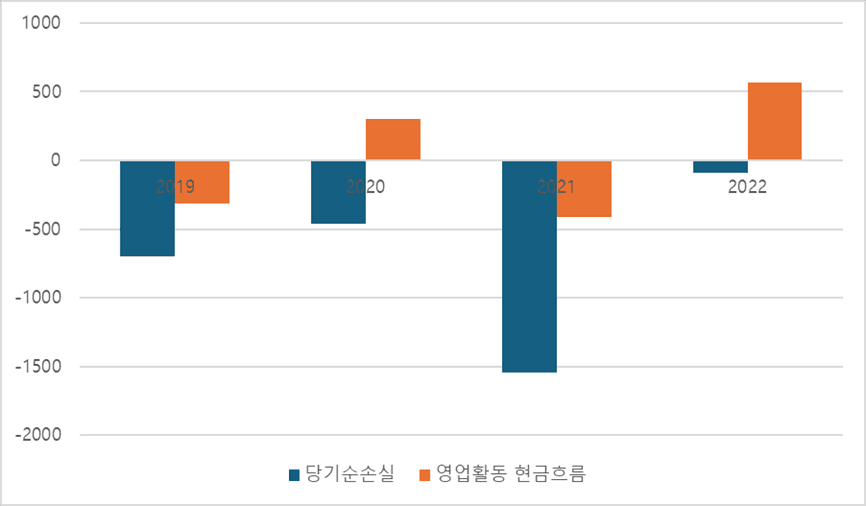 그림 1: 쿠팡의 당기순이익 vs. 영업활동 현금흐름 (2019-2022)